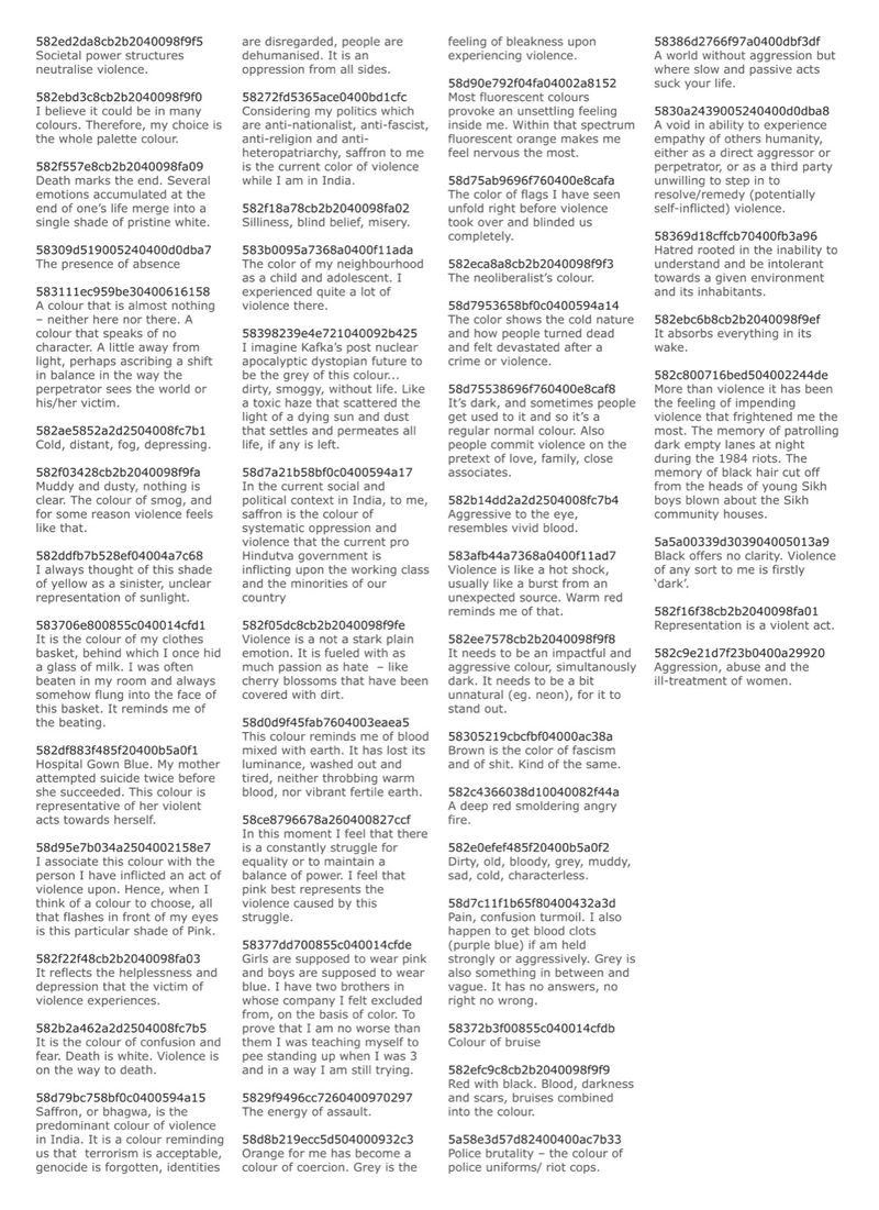 Political parties and media are comfortable with the political position of attributing ‘no colour’ on religious, community or ideology based acts of violence so as to avoid issues of colour associations and its apparent, actual or perceived impacts on society. The inherent logic of the project takes their view and reverses it by stating that “Violence has a colour – it is a value of an acquired understanding unique to each individual.” The project is an artist experiment based on no previous survey or standardisation. The choice of the participants are purely their own, which is to say formed by unique combination of various elements such as parenting, religion, gender, social circles, peer group and education to name a few.