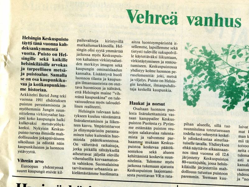 In Maunula, the park includes several natural ecosystems - spruce and pine forests, a hazel grove, meadows, an allotment garden, and a stream that encircles the Maunula area. While citizens have fervently maintained its sanctity as a resource as well as preserved its histories, they now defend the park against bureaucratic machinery – city plans that threaten the park’s ecology by new housing blocks and urban boulevard developments.