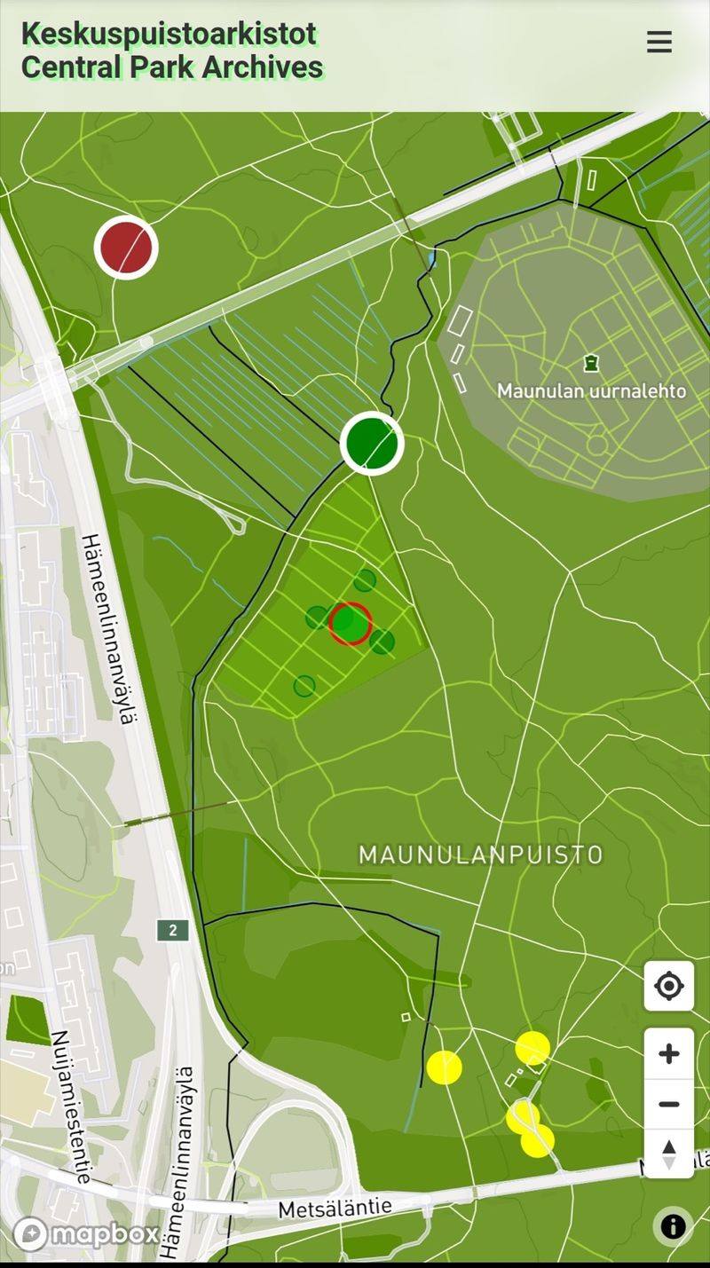 Visitors experienced the archive on-site, by walking in the forest. Through the walk, the audience/participants explored the hybridised physical+digital space through stories, interviews, and ambient soundscapes presented as audio files, as well as photographs and archive documents. Through the website’s “exploration mode” they found the mapped elements by following the increasing volume of the sounds as they grew nearer and other directions provided by the interface. With aerial photos from previous decades, the map interface also makes visible the geographical changes to the Park, the Maunula area, and its surroundings.