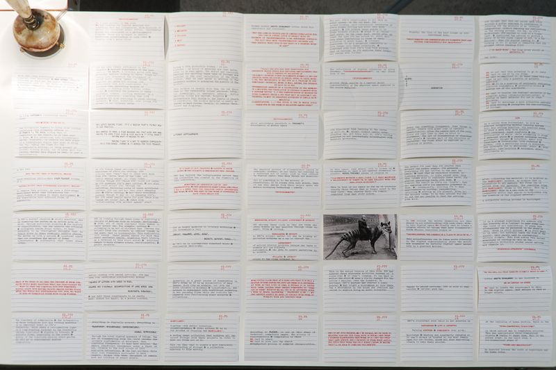 Walking into the gallery space of Forum Box during the exhibition Kirjasto/Library (11.12.2020 – 3.1.2021), one is greeted by multiple expanses of the processual and procedural – a methodically arranged exhibition sections drawings, a grid of paintings, imprints, technical metadata, index cards of conversations, logs, videos, scrolls of automatic writing, soundscapes, as well as collected and found objects (both revealed and hidden).
