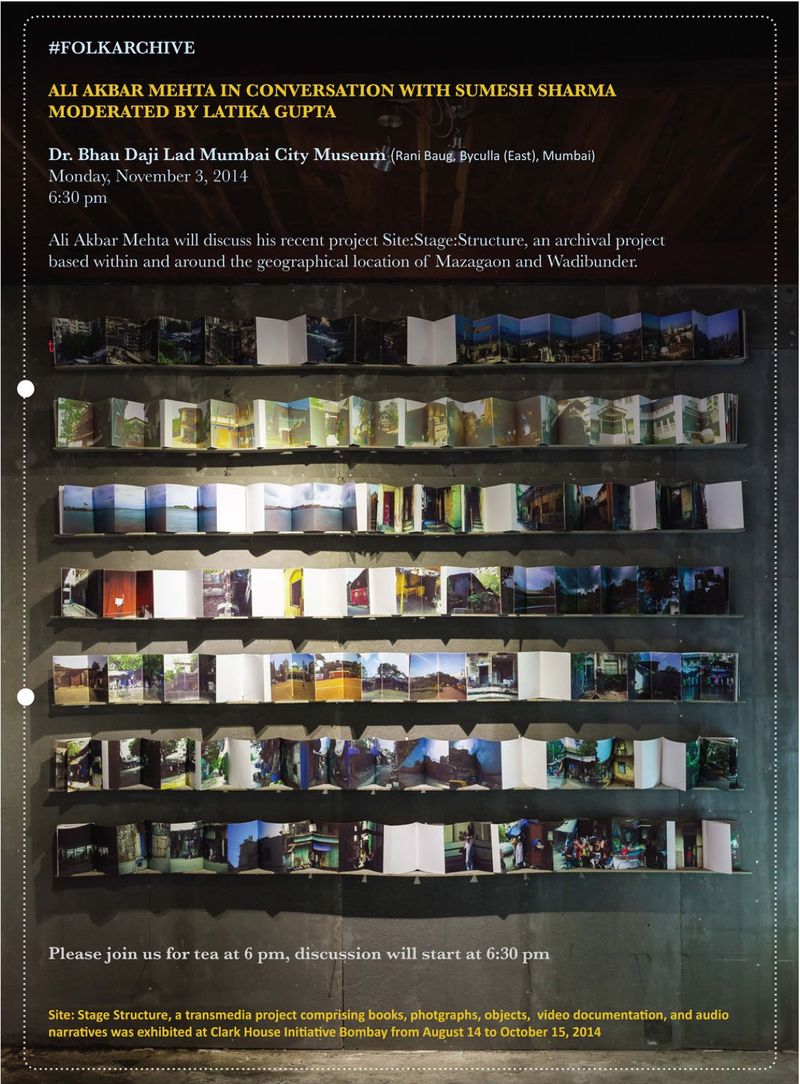 An artist talk and presentation about Site : Stage Structure, and a subsequent conversation between Artist Ali Akbar Mehta, curator and director of Clark House Initiative Sumesh Sharma, and writer Latika Gupta.
