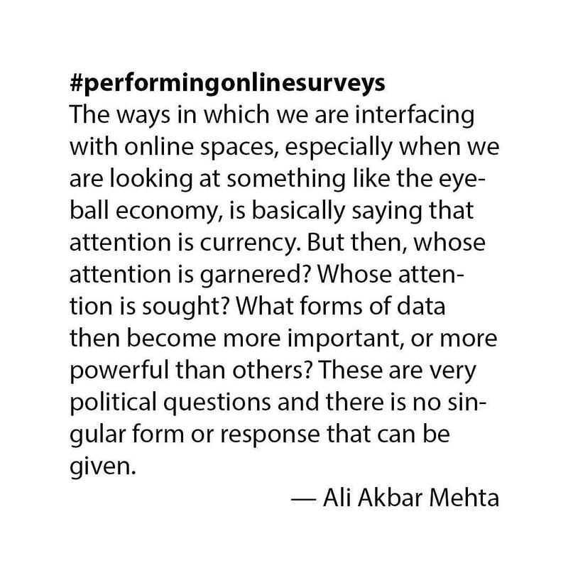 VC: You have been researching this project for four years. I went through the survey on the website and found it pretty provocative. As a participant/user it made me go through endless possibilities for each of your questions. For example, the gender question had twenty options I could choose from. It made me analyse myself, like I was performing. How does this “encounter,” this way of engaging, create new forms of knowledge systems?